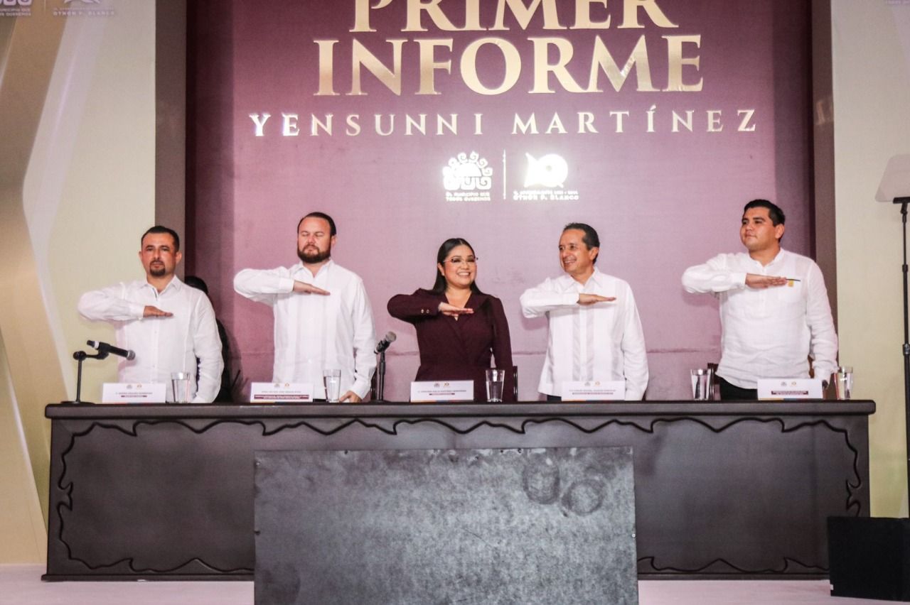 En su intervención, el gobernador del estado de Quintana Roo, Carlos Manuel Joaquín González, felicitó a la edil othonense por la entrega de su primer informe de gobierno; indicó que el trabajo en unidad trajo resultados sólidos al estado, en la construcción de un destino más amplio que beneficie a las y los quintanarroenses.