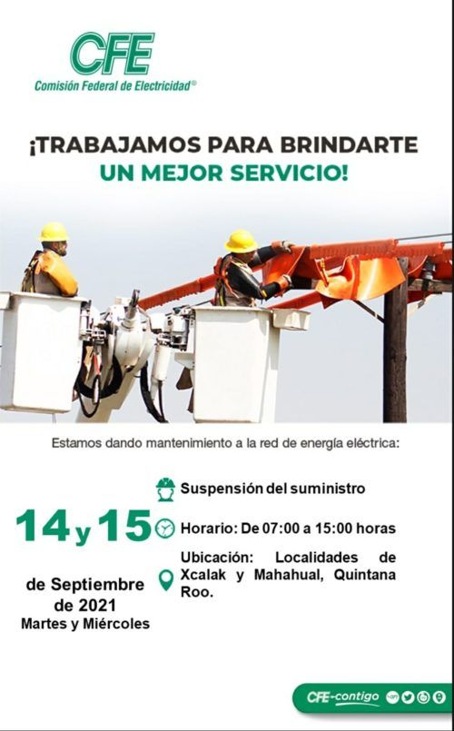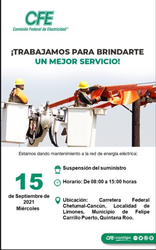 Y en Felipe Carrillo Puerto, desde las 7 de la mañana, hasta la 3 de la tarde, la comunidad de Limones se quedará sin luz.