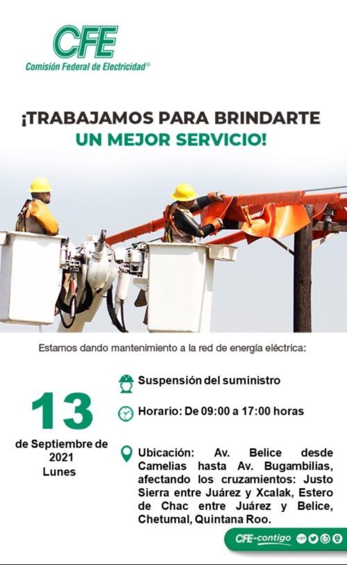 CHETUMAL, Quintana Roo, 13 de septiembre. – Sin energía eléctrica por más de 8 horas, pasarán algunas zonas de Chetumal, Mahahual y Felipe Carrillo Puerto, Quintana Roo, informó la Comisión Federal de Electricidad (CFE).