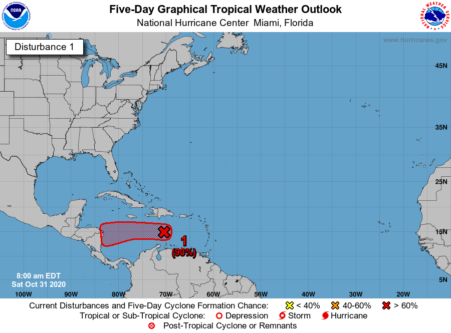 Este sistema está mejorando su organización gradualmente, y las condiciones están conducentes para desarrollo adicional. Se espera que una depresión tropical se forme durante el próximo día a medida que el disturbio se mueva generalmente hacia el oeste en camino al oeste del Mar Caribe.