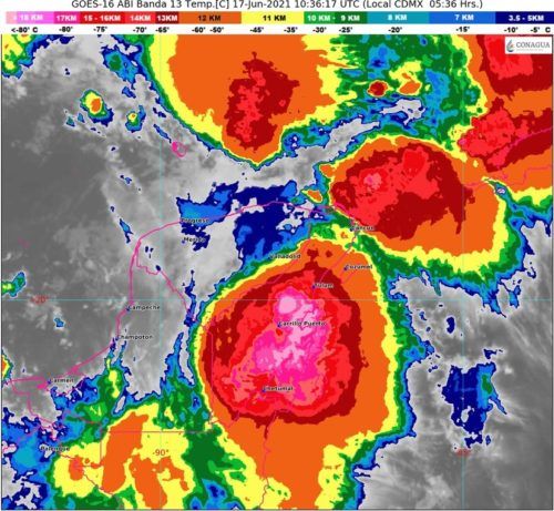 PLAYA DEL CARMEN, Quintana Roo, 17 de junio. – El Sistema Metrológico Nacional reporta que la zona de baja presión ahora se encuentra con 90 por ciento de probabilidad alta para desarrollo ciclónico en 48 horas, se localiza aproximadamente a 60 kilómetros al noreste de Coatzacoalcos, Veracruz, se encuentra semiestacionario. Este sistema produce lluvias intensas a torrenciales, que continuarán en los siguientes días, principalmente en puebla, Veracruz, Tabasco, Campeche, Yucatán y Quintana Roo.
