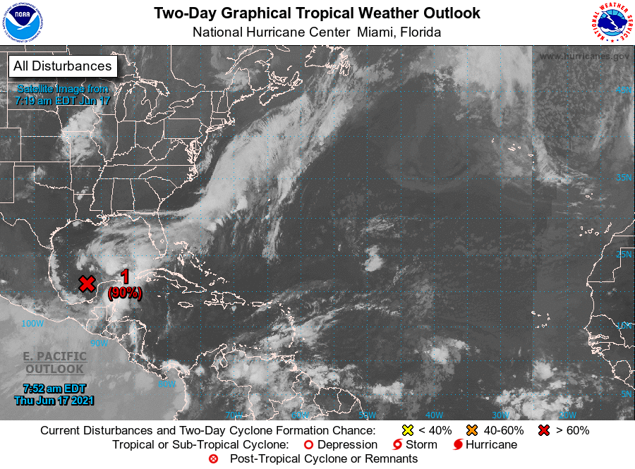 De acuerdo con el Centro Nacional de Huracanes de los Estados Unidos. La zona de baja presión tiene 90% de probabilidad alta para desarrollo ciclónico en 48 horas.