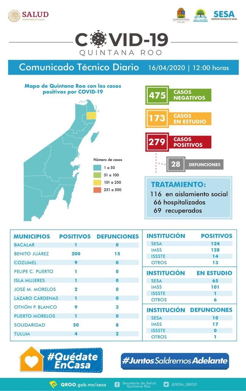 El reporte de este jueves señala que ya son 28 defunciones debido al COVID-19, con 279 casos positivos, 173 casos en estudio y 475 casos negativos ante las pruebas.