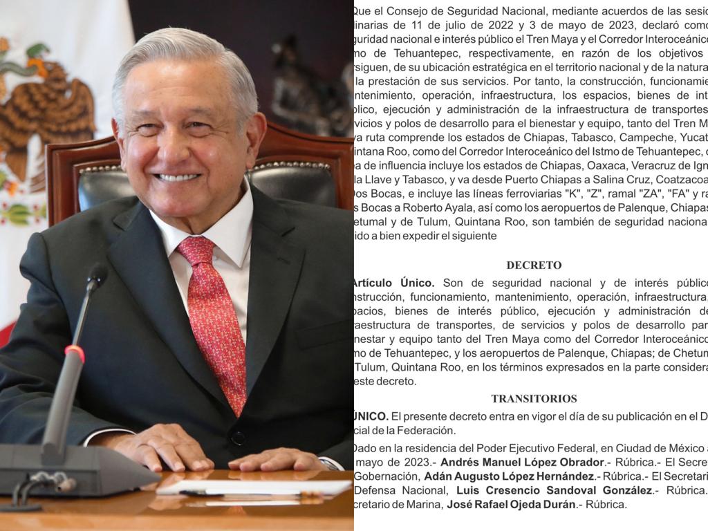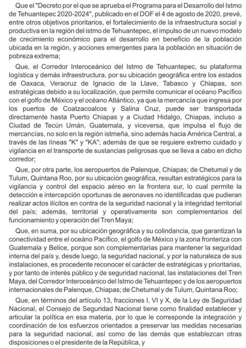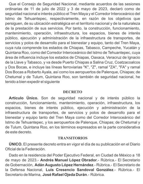“Son de seguridad nacional y de interés público la construcción, funcionamiento, mantenimiento, operación, infraestructura, los espacios, bienes de interés público, ejecución y administración de la infraestructura de transportes, de servicios y polos de desarrollo para el bienestar y equipo tanto del Tren Maya como del Corredor Interoceánico del Istmo de Tehuantepec, y los aeropuertos de Palenque, Chiapas; de Chetumal y de Tulum, Quintana Roo, en los términos expresados en la parte considerativa de este decreto”, precisa el documento.