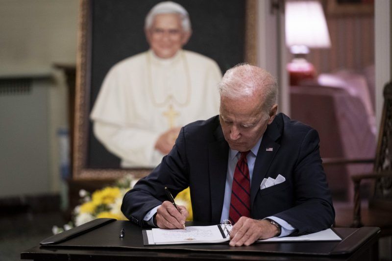 En una corta visita, donde saludó al arzobispo Christophe Pierre, el nuncio apostólico en Estados Unidos, Biden escribió un mensaje en el libro de condolencias para el papa emérito.