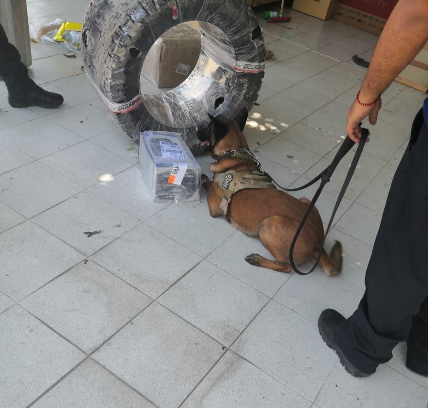 En un recorrido de vigilancia para detectar narcóticos, los policías municipales acompañados por el oficial canino “Escobar”, ingresaron a la bodega de la paquetería ubicada en la central camionera de la colonia Centro en la avenida 20 entre calles 12 y 12 bis, cuando el can luego de una verificación se mostró en posición de alerta ante un paquete, al solicitar la autorización con el encargado del lugar para corroborar, encontraron que este contenía una bocina color negra que en su interior tenía un rollo con una bolsa de plástico que envolvía un frasco color oscuro con una sustancia espesa con características similares al extracto de cannabis (sustanciaba determinar) por lo que se procedió al aseguramiento del paquete para los tramites legales correspondientes.