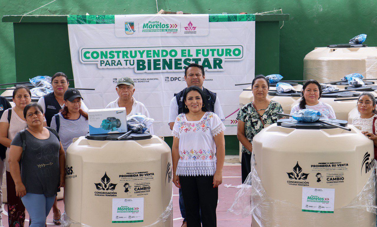 Puerto Morelos, Quintana Roo a 20 de junio de 2025.- La presidenta municipal Blanca Merari Tziu Muñoz, acompañada del secretario de Bienestar Alexander May Chi, constató la entrega de tinacos a familias de Puerto Morelos, con lo que se continúa cumpliendo el compromiso de seguir trabajando por las y los habitantes del municipio en pro de mejorar su calidad de vida, a través de programas como “Construyendo el Futuro para el Bienestar”.