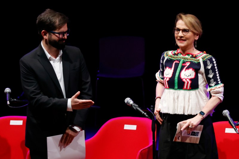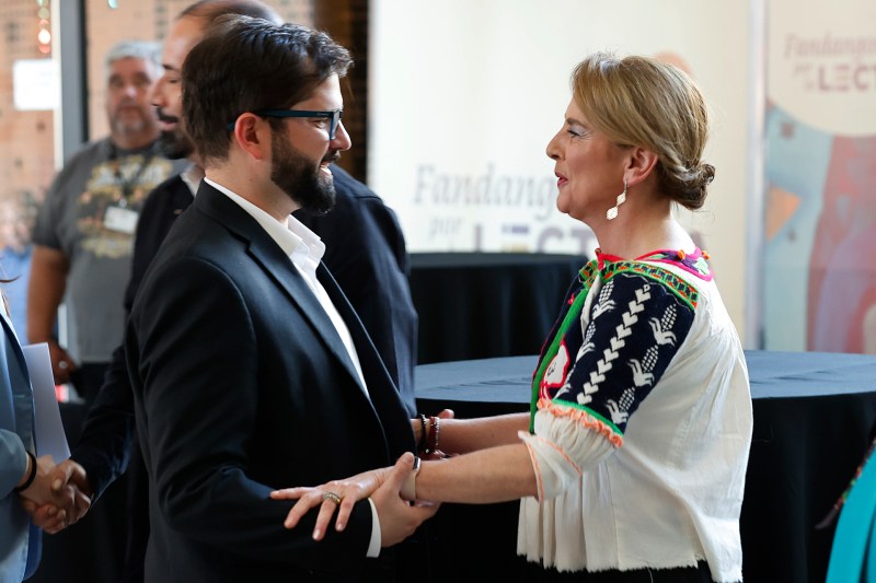 El presidente chileno, Gabriel Boric, junto a la coordinadora sociocultural de la Presidencia, Irina Karamanos, y la consejera de Memoria Histórica y Cultural de México y esposa del presidente Andrés Manuel López Obrador, Beatriz Gutiérrez, homenajearon a la escritora y pedagoga chilena Gabriela Mistral en la celebración de los 100 años de su llegada a México, durante el Fandango por la Lectura celebrado este lunes.