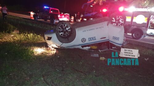 Por el impacto el taxi 3083, terminó volcado en el camellón central pero la parte posterior quedó desecho, donde una mujer que iba como pasajera murió a consecuencia del percance.
