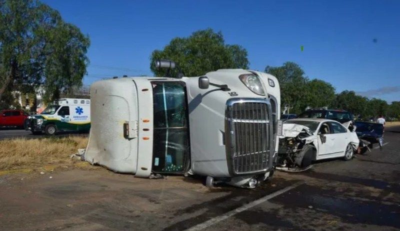 Al realizar una maniobra evasiva la cabina volcó sobre su costado izquierdo, lo que a su vez derivó en que se estrellaran un auto blanco, una camioneta azul y otra camioneta.