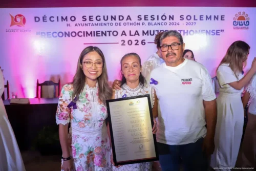 Chetumal, 27 de marzo. En sesión solemne de Cabildo, el Ayuntamiento de Othón P. Blanco reconoció a Wilma Contreras Canto y Brenda Hernández Vázquez como Mujeres Othonenses 2026, destacando su liderazgo y compromiso social en favor del bienestar comunitario.