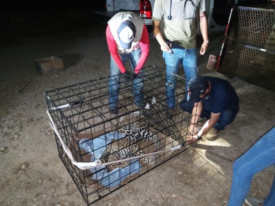 Se arribó al lugar con la persona que realizó el reporte quien se encontraba en compañía pobladores los cuales habían asegurado y resguardado al ejemplar al ser encontrado herido en el crucero de entrada a la localidad, inmediatamente dadas las condiciones que presentaba el jaguar se procedió a inyectarle una dosis de sedante para después ser colocado en una jaula.