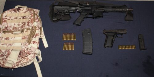 De inmediato, los oficiales iniciaron una persecución que concluyó metros adelante con el aseguramiento de la persona, y al realizarle una revisión de seguridad encontraron en la parte delantera del lado derecho de su cintura, fajada entre el pantalón y la camisa un arma de fuego con un cargador abastecido con 12 cartuchos calibre 9 milímetros, de igual forma al verificar el objeto que dejó caer durante su huida, los oficiales corroboraron que se trataba de un arma de fuego tipo fusil con un cargador y 18 cartuchos calibre .223.