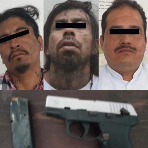 PLAYA DEL CARMEN, Quintana Roo, 03 de diciembre. – Tres personas fueron detenidas con un arma fuego después de intentar escapar de la policía, poco antes de la medianoche de este jueves. El reporte indica que una patrulla detectó que en un taxi tipo Versa con número 978 del sindicato “Lázaro Cárdenas”, viajaban el chofer y dos pasajeros con actitud sospechosa, por lo que les solicitó el alto sobre las avenidas Constituyentes con Lilis, en el fraccionamiento Misión de las Flores.