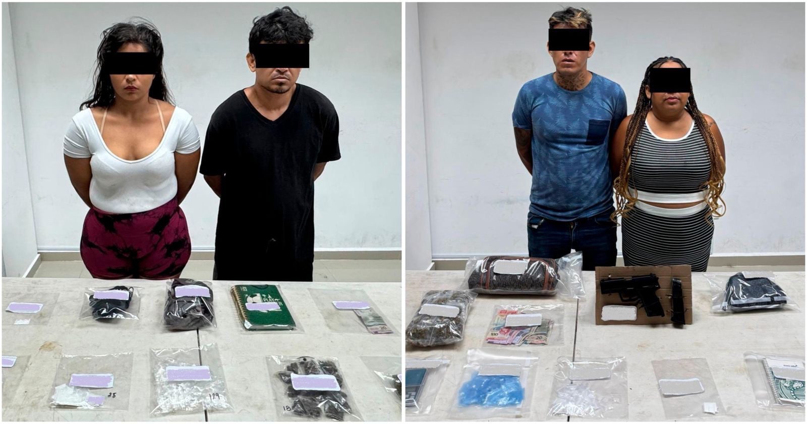 CANCÚN, Quintana Roo, 04 de julio.- Por presuntos delitos contra la salud y posesión de un arma de fuego, fueron detenidas cuatro personas en dos operativos en la supermanzana 259, donde se presumió estaban encargados de la distribución de estupefacientes y otros delitos de alto impacto.