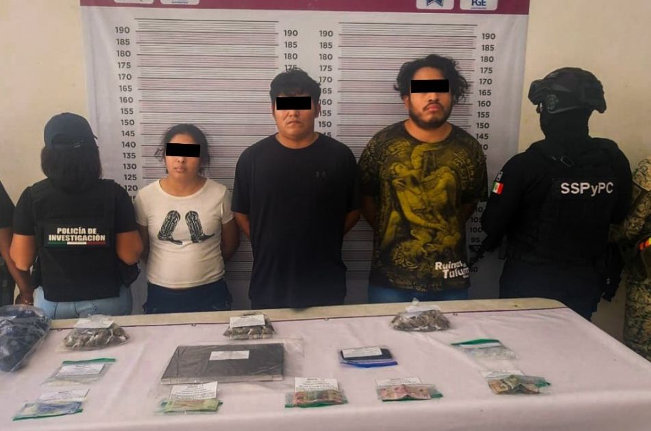 TULUM, Quintana Roo, 6 de enero de 2026.— Policías de Investigación de la Fiscalía General del Estado, en coordinación con elementos de la Secretaría de la Defensa Nacional y de la Secretaría de Seguridad Ciudadana Municipal, detuvieron en flagrancia a dos hombres y una mujer por su presunta participación en delitos contra la salud, en su modalidad de narcomenudeo, en el municipio de Tulum.