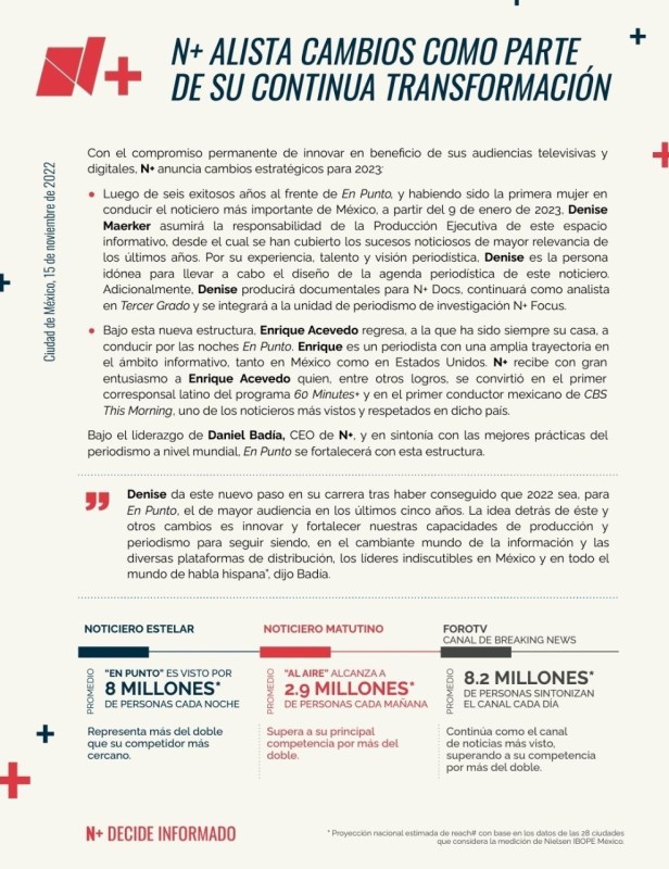 Estos cambios responden a nuestro compromiso de conectar con las distintas audiencias por medios de la experiencia y vocación de nuestros comunicadores, contenidos oportunos y plurales y lo último en tecnología”, añadió Daniel Badía, CEO de N+.