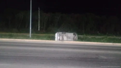 PLAYA DEL CARMEN, Quintana Roo, 12 de abril de 2026.- Un percance automovilístico entre una unidad de carga pesada y una camioneta particular dejó como saldo un vehículo volcado y daños materiales significativos sobre el tramo carretero Petempich–Puerto Morelos.