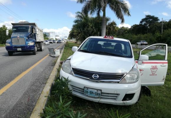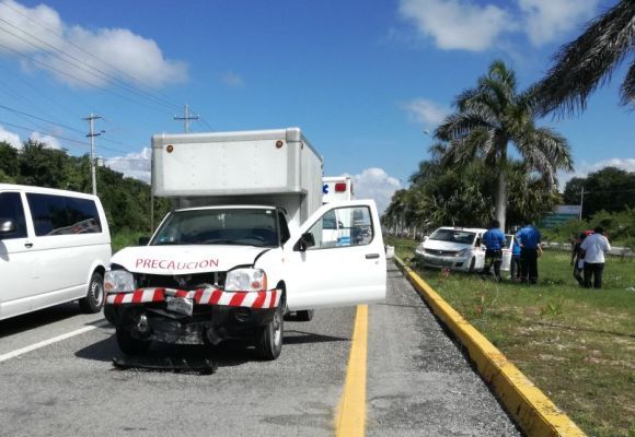 PLAYA DEL CARMEN, Quintana Roo, 7 de febrero.- Múltiple accidente de tránsito se registró sobre carretera federal, a unos 7 kilómetros al norte de la ciudad, cuando el conductor de un camión tipo Volteo, colisionó por alcance una camioneta, que al salir proyectada chocó un taxi del municipio de Tulum, este también se proyectó contra un vehículo particular, pero pese a lo aparatoso del accidente no se reportaron personas lesionadas, lo que permitió que los involucrados se arreglaran en el lugar.