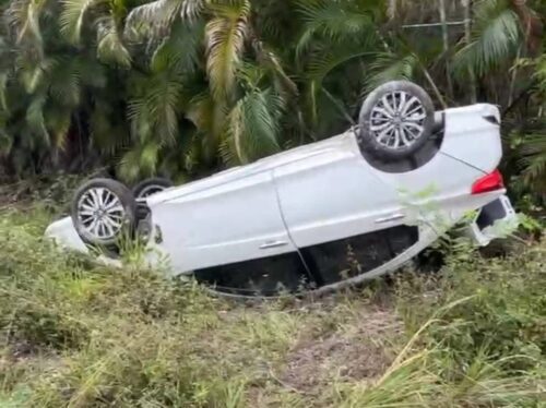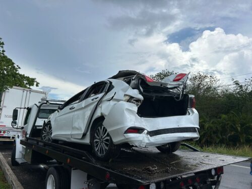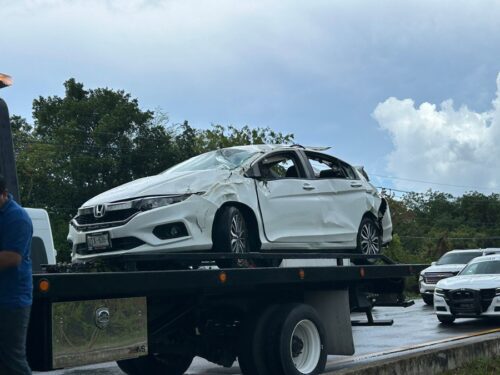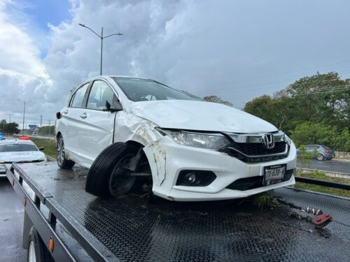 Playa del Carmen, 25 de junio del 2025.- Un fuerte accidente vehicular se registró este mediodía sobre la carretera federal 307, cuando un camión que circulaba a exceso de velocidad impactó por alcance a un automóvil particular, provocando que saliera de la vialidad y volcara en una zanja. Afortunadamente, no se reportaron personas lesionadas.