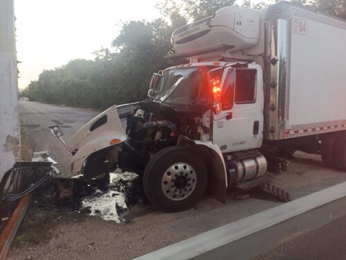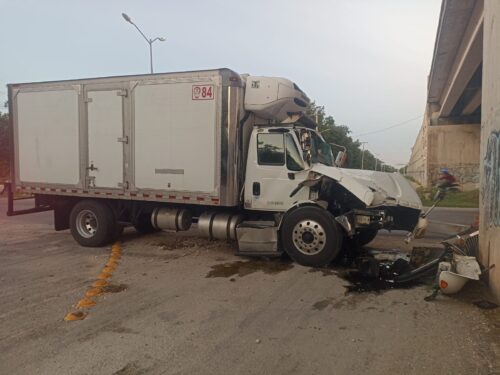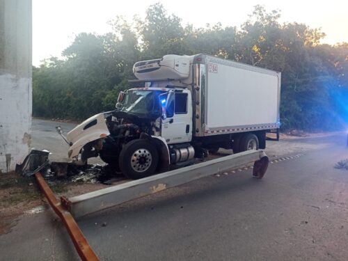 Playa del Carmen, Quintana Roo, 29 de julio de 2025.-Un camión de la empresa Maharaja resultó severamente dañado y su conductor lesionado, luego de estrellarse contra la base de un puente vehicular a la altura del fraccionamiento Real Ibiza, presuntamente tras haberse quedado dormido al volante.