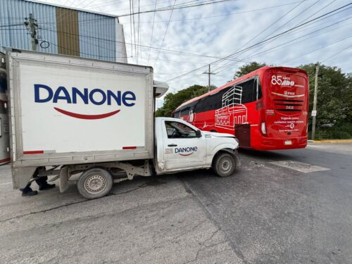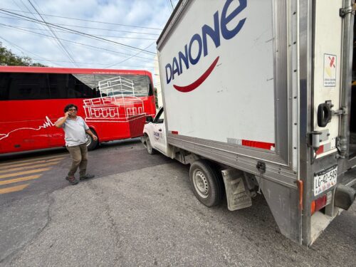 El percance ocurrió alrededor de las 14:00 horas, cuando el chofer de una camioneta repartidora de la empresa Danone circulaba sobre la avenida 45 y, al llegar al cruce con la calle 6, se lanzó a atravesar sin respetar la preferencia de paso, pese a que momentos antes ya había cruzado el autobús ADO número económico 2730.