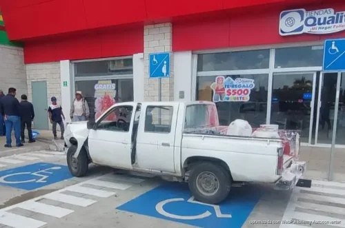 PLAYA DEL CARMEN, Quintana Roo, 2 de abril de 2026.— Un conductor protagonizó un accidente la mañana de este jueves al perder el control de su camioneta y estrellarse contra la fachada de una tienda en el fraccionamiento El Edén.