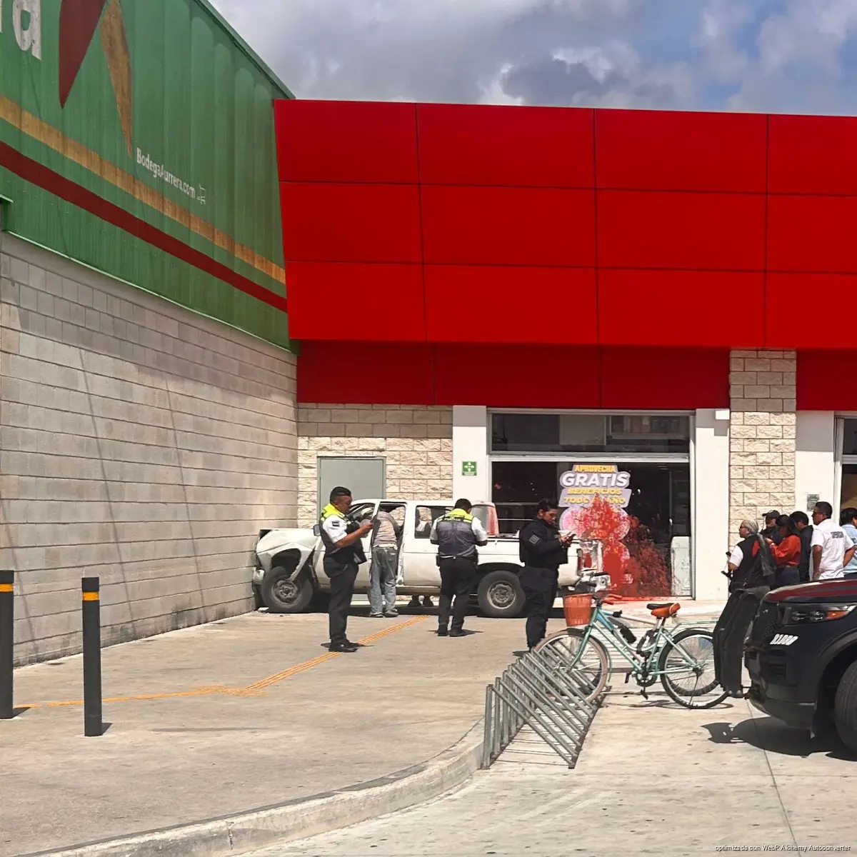 De acuerdo con los primeros reportes, el conductor de una camioneta Nissan tipo estaquitas, color blanco, se encontraba estacionado cuando, por un error, aceleró en lugar de frenar, subiéndose a la banqueta e impactándose contra una de las entradas del establecimiento.