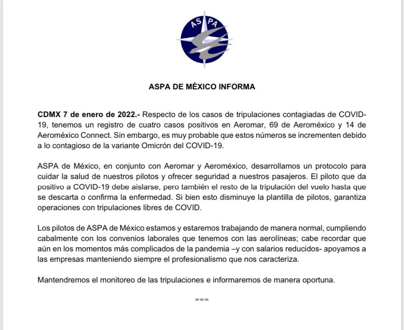 “La nueva ola de contagios por COVID-19 ha impactado la aviación mundial provocando afectaciones en algunos vuelos. (…) Nos encontramos aplicando protocolos de seguimiento a diversos colaboradores, incluyendo las tripulaciones, lo que ha implicado la realización de ajustes en las operaciones planeadas”, informó Aeroméxico en un comunicado.