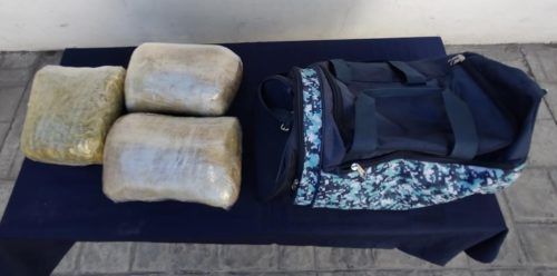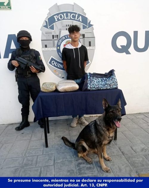 PLAYA DEL CARMEN, Quintana Roo, 10 de marzo. –  En la terminal de autobuses de la ADO de Playa del Carmen la Unidad Canina de la Policía Quintana Roo, detectó a un joven con tres paquetes de presunta “marihuana”.
