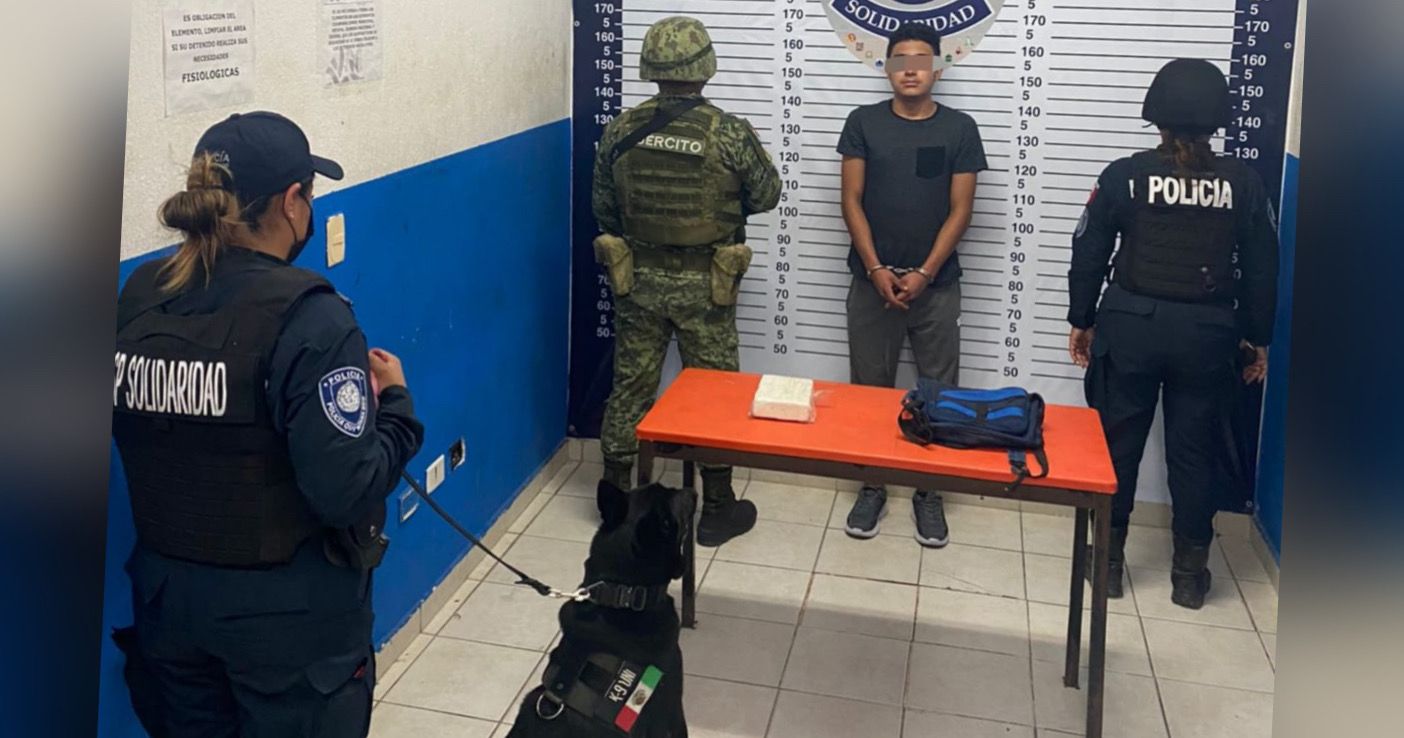 PLAYA DEL CARMEN, Quintana Roo, 17 de marzo. – Una persona fue asegurada por policías de la Secretaría de Seguridad Pública y Tránsito Municipal de Solidaridad y elementos de la Secretaría de la Defensa Nacional cuando intentaba ingresar al municipio en posesión de un ladrillo enplayado con polvo blanco al parecer cocaína.