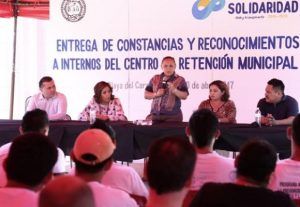 PLAYA DEL CARMEN, Quintana Roo, 11 de Abril.- “Con este certificado y los conocimientos adquiridos, ustedes podrán ganarse la vida allá afuera de manera correcta y sana, lo que les permitirá no regresar a este lugar, sino que podrán decir a sus familiares y amigos que están listos para afrontar al mundo exterior y hacer las cosas de manera correcta y legal”, aseguró la Presidenta Municipal de Solidaridad, Cristina Torres Gómez, a internos del Centro de Retención Municipal (CRM).