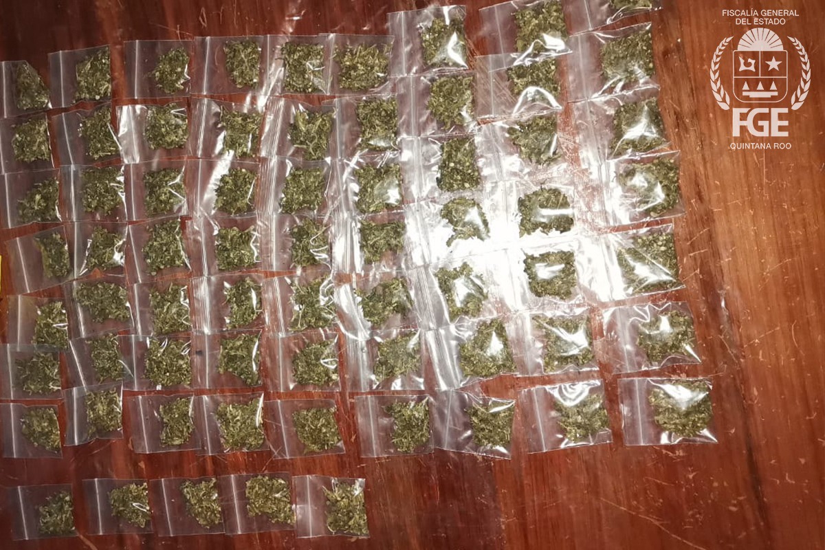 En las diligencias que realizó la FGE, incautaron 129 dosis de hierba seca con las características propias a la marihuana y una bolsa de naylon que contenían el mismo vegetal, 7 envoltorios confeccionados con papel aluminio y plástico que en su interior había polvo blanco similar a la cocaína, 36 bolsitas de plástico tipo ziploc de color negro que en su interior tenían una sustancia solida con características a la cocaína en piedra, la droga asegurada quedó a disposición de la Fiscalía Especializada en Investigación de Delitos Contra la Salud en su Modalidad de Narcomenudeo.