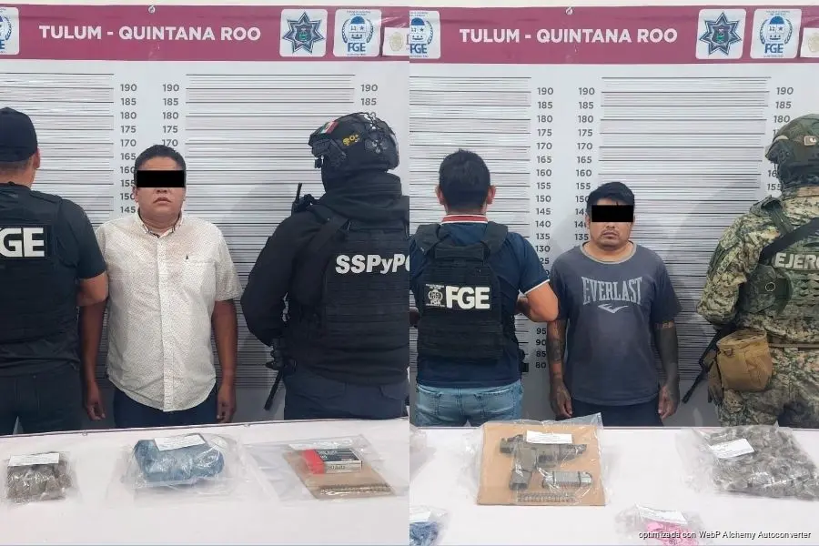 Tulum, Quintana Roo, 5 de febrero de 2026.- Por su presunta relación en hechos posiblemente constitutivos de delitos contra la salud en su modalidad de narcomenudeo, agentes de la Fiscalía General del Estado, Secretaría de la Defensa Nacional y Policía Municipal, detuvieron en flagrancia a dos masculinos, a quienes le aseguraron presuntos estupefacientes y un arma de fuego, en este municipio.