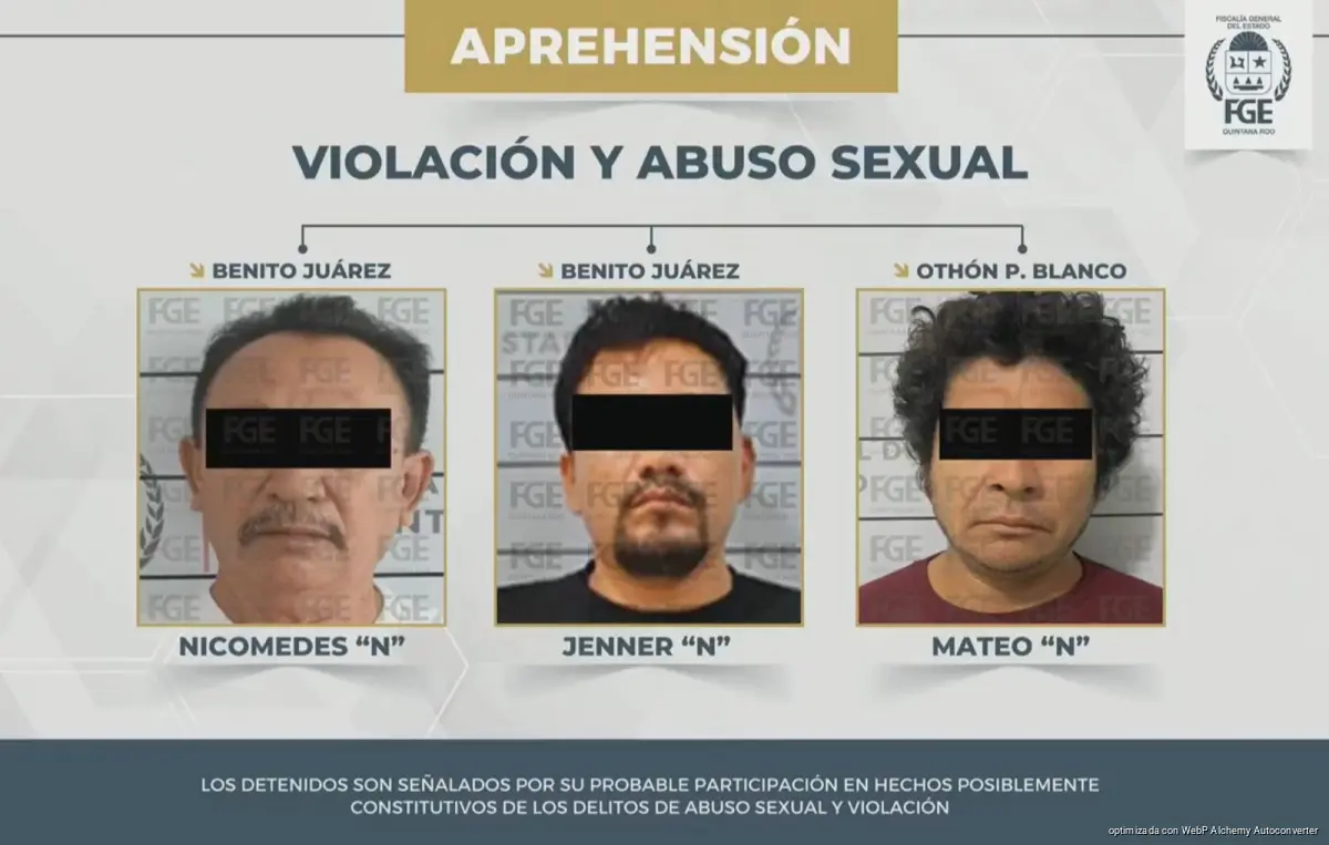 CANCÚN, Quintana Roo, 2 de marzo de 2026.-Las autoridades ministeriales confirmaron la detención de tres hombres señalados por su presunta responsabilidad en delitos de violación y abuso sexual en distintos puntos de Quintana Roo.