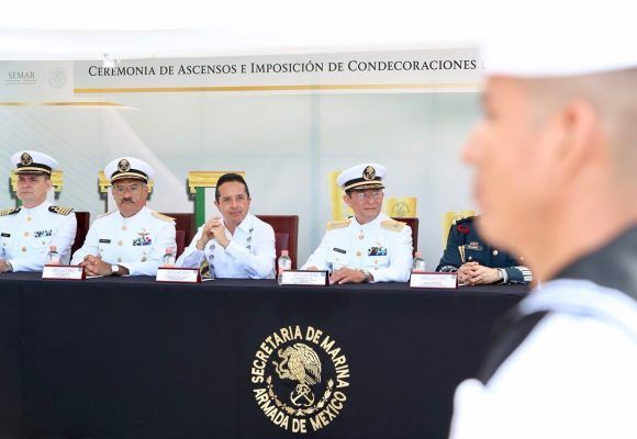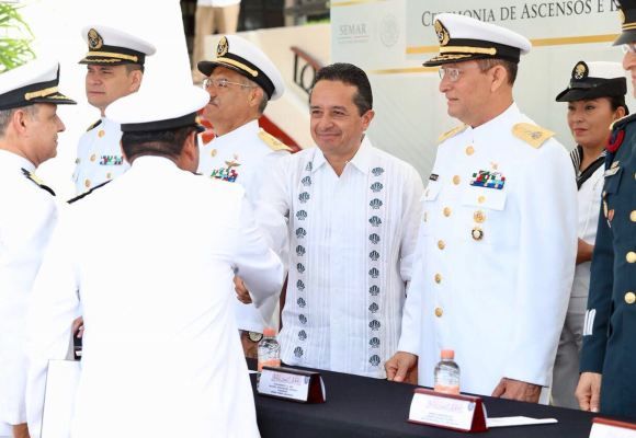Previamente, el gobernador Carlos Joaquín asistió a la ceremonia de ascensos e imposición de condecoraciones a 85 elementos en la 11ª Zona Naval con sede en Chetumal.