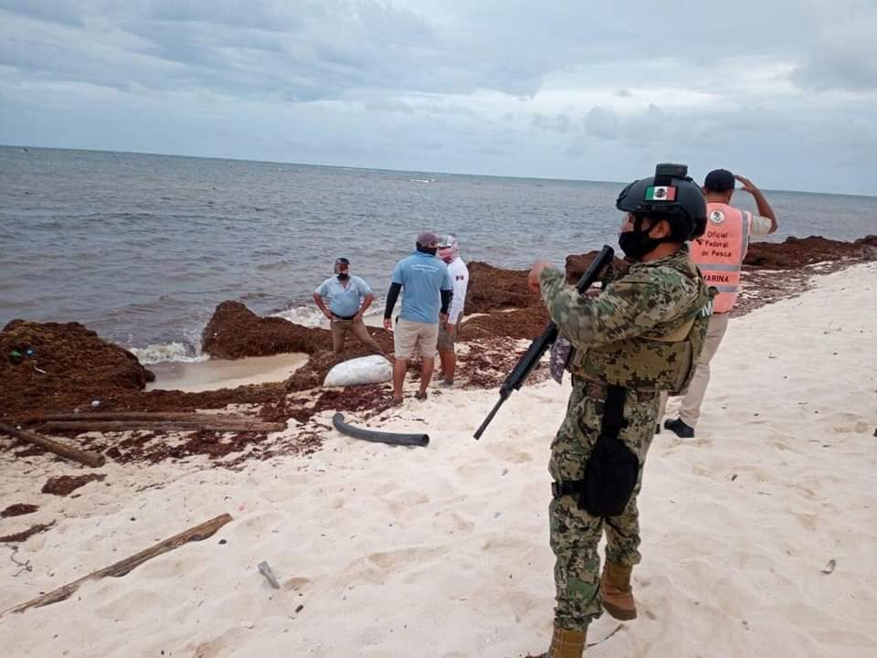 Mediante un operativo en la zona de Majahual-Río Indio, agentes de la Armada de México detectaron una embarcación con tres personas que descargaban costales.