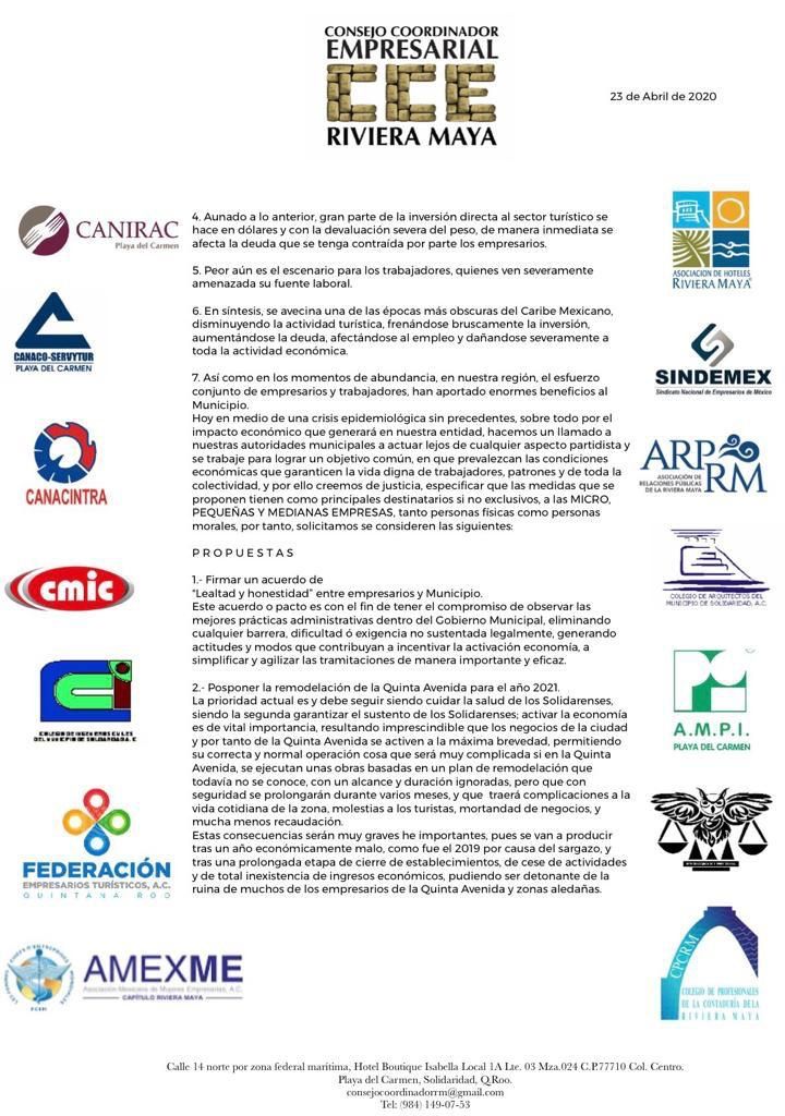 PLAYA DEL CARMEN, Quintana Roo, 23 de abril.- El presidente del Consejo Coordinador Empresarial de la Riviera Maya, Lenin Amaro Betancourt en representación de las organizaciones empresariales que lo conforman proponen al Gobierno Municipal de Solidaridad seis puntos para activar mecanismos compensatorios y de apoyo que rescaten a todos los actores de la economía, principalmente a al Micros, Pequeñas y Medianas Empresas (Mipymes) para que prevalezcan las condiciones económicas que garanticen la vida digna de trabajadores, patrones y de toda la colectividad.