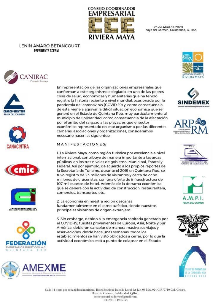 “Estamos convencidos de que en estos momentos tan difíciles que sólo el diálogo abierto y constructivo, el respeto a las posturas destinadas permitan alcanzar acuerdos concretos para que la Riviera Maya supere esta difícil y desconocida crisis”, concluyó.