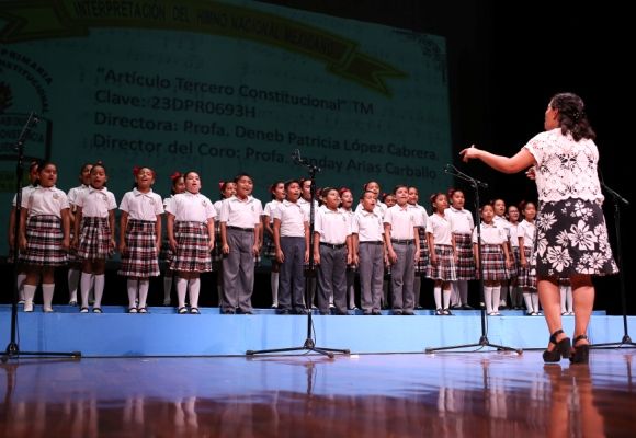 PLAYA DEL CARMEN, Quintana Roo, El Gobierno de Solidaridad y la Secretaría de Educación (SEQ) de Quintana Roo suman esfuerzos para reconstruir el tejido social al fomentar los valores cívicos entre los niños y jóvenes por medio del Concurso Municipal de Interpretación del Himno Nacional Mexicano de escuelas de educación primaria en el Teatro de la Ciudad.