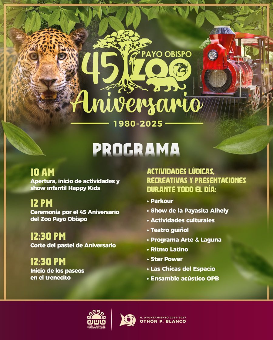 CHETUMAL, 14 de marzo. La presidenta municipal de Othón P. Blanco, Yensunni Martínez Hernández, invitó a la ciudadanía y turistas por igual para que asistan a la gran celebración del 45 Aniversario del Zoológico Payo Obispo.