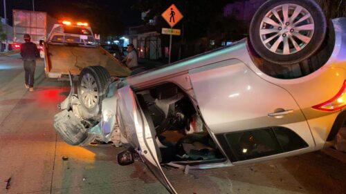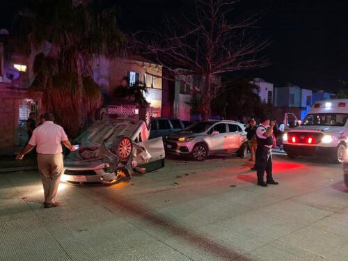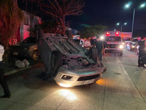 PLAYA DEL CARMEN, Quintana Roo, 07 de diciembre. – Un coche que estaba mal estacionado en el Arco Vial terminó volcado, luego de ser embestido por un automóvil, cuyo conductor se enfrascó en una riña con los agentes de Tránsito.