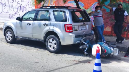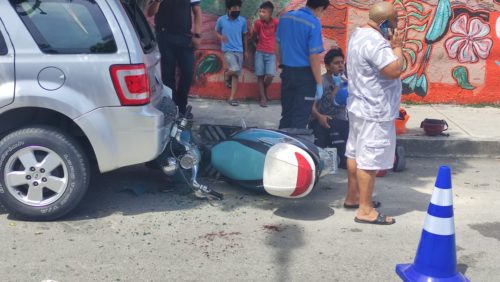 PLAYA DEL CARMEN, Quintana Roo, 05 de marzo.- .el conductor de una motocicleta que circulaba sobre la avenida 85 al llegar a la altura de la calle 24 observó que personal de una empresa de telefonía se encontraba realizando sus labores y para evitar colisionar contra estos realizó una maniobra la cual no le salió bien y chocó contra una camioneta.