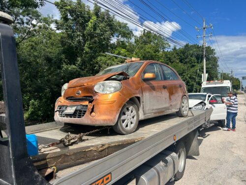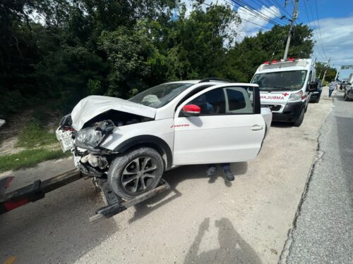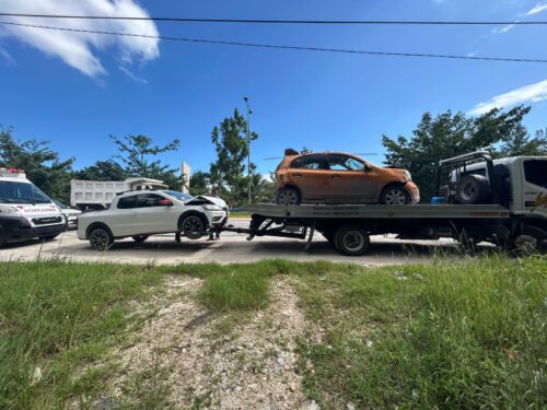 PLAYA DEL CARMEN, Quintana Roo, 19 de noviembre de 2025.– Chocaron tres vehículos en una carambola registrada sobre el bulevar Playa del Carmen, a la altura de la entrada del fraccionamiento Selvamar, lo que dejó tres personas lesionadas y daños materiales considerables en dos unidades.