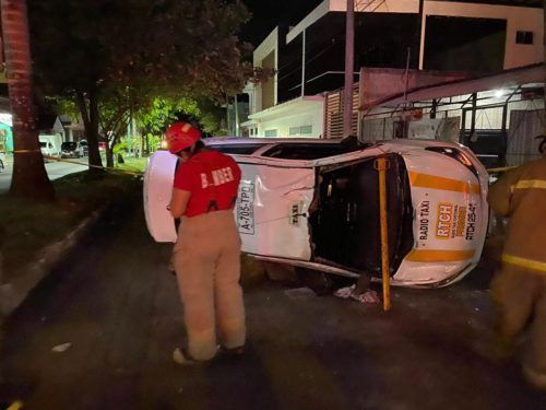 Verificaron que el taxi con número económico 1654, que se encontraba volcado sobre su lado derecho.