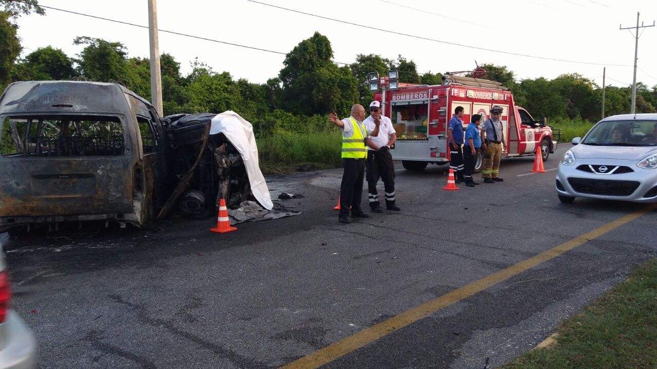 PLAYA DEL CARMEN, Quintana Roo, 29 de Junio.- Dos Personas calcinadas y cinco personas más trasladadas diferentes hospitales de Playa del Carmen fue el saldo de un choque y el incendio de una camioneta de transporte público en el que se vieron involucrados otros dos automóviles.