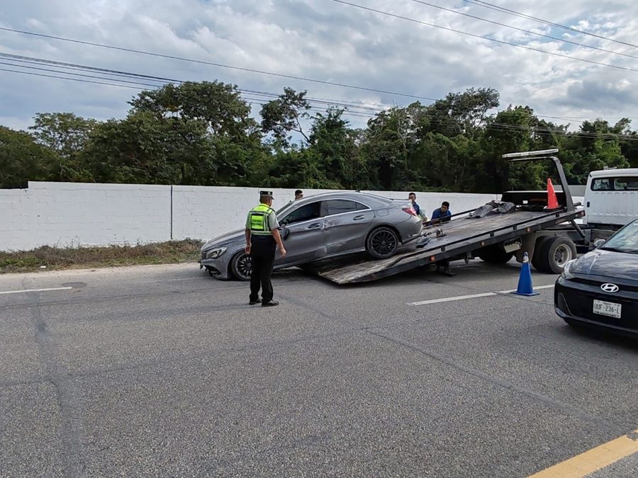 El accidente se registró frente a la entrada de este club de playa, a pocos kilómetros del fraccionamiento Puerto Maya en la alcaldía de Puerto Aventuras. Según los primeros reportes, un Renault Kwid color naranja fue impactado en un costado por un Mercedes Benz CL200 color gris, lo que provocó que ambos conductores perdieran el control y se estrellaran contra la estructura.