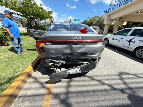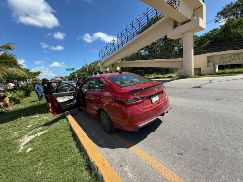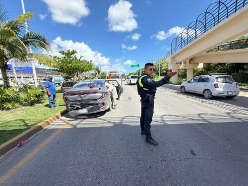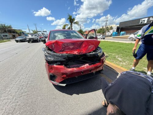 PLAYA DEL CARMEN.- La tarde del sábado se registró un aparatoso accidente sobre el boulevard Playa del Carmen, a la altura de la avenida 28 de Julio. El percance, que involucró a dos vehículos particulares, dejó solo daños materiales y generó un importante congestionamiento vehicular.
