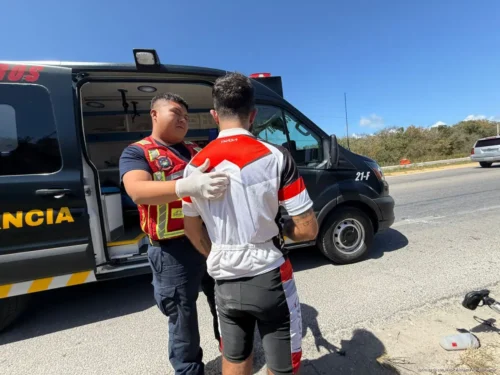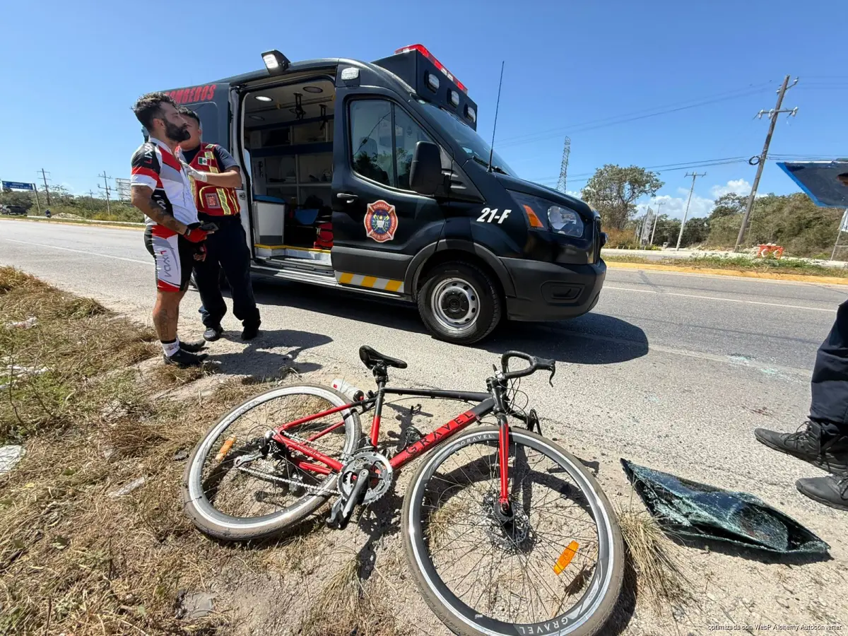 PLAYA DEL CARMEN, Quintana Roo, 28 de febrero de 2026.— Un ciclista resultó con lesiones leves luego de impactarse contra la parte trasera de una van de transporte foráneo que se encontraba detenida para el ascenso de pasajeros sobre la carretera federal 307, a la altura de la conocida curva de Pamul, en el tramo Felipe Carrillo Puerto–Playa del Carmen.