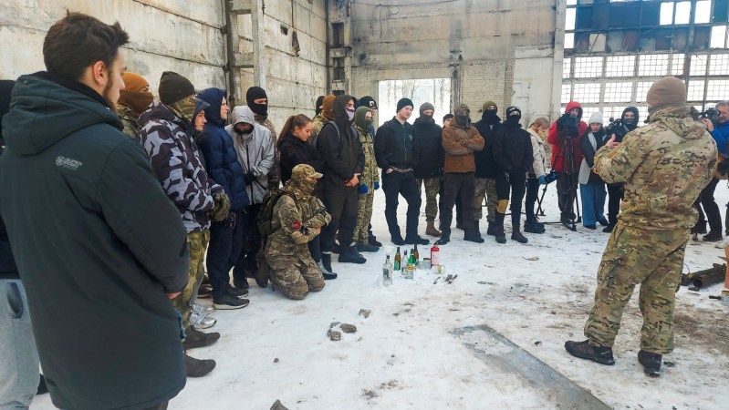 Varios cientos de civiles ucranianos armados con fusiles de madera juegan a la guerra en las ruinas de una antigua fábrica de tractores en Kiev, donde aprenden los rudimentos de la defensa de la ciudad en caso de invasión rusa.